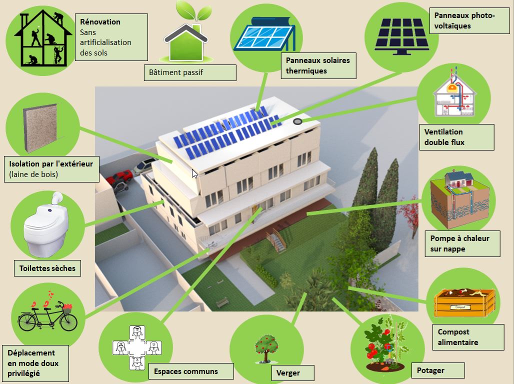 Ecologie : Un habitat engagé à minimiser son impact sur l’environnement à toutes les étapes : Des matériaux de construction éco-responsables, de très faibles consommations d'énergie, une mutualisation des équipements et des espaces, un jardin partagé avec potager pour promouvoir la permaculture en ville. Un habitat limitant l’usage de la voiture et favorisant les modes doux.